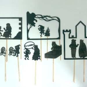 Con solo una linterna y este set, puedes transformar cualquier habitación en un teatro encantado. Coloca las siluetas sobre sus varillas, apaga las luces… y deja que las sombras cuenten la historia del misterioso enano que sabía hilar oro.